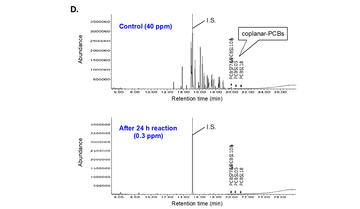 D. The result of reacting 40 mg mL-1 of commercial PCBs with composite type of catalytic enzyme, it degraded to 0.3 mg mL-1 in comparison with the control (top) within 24 hours (bottom). PCBs was analyzed by gas chromatograph quadrupolemass spectrometer.