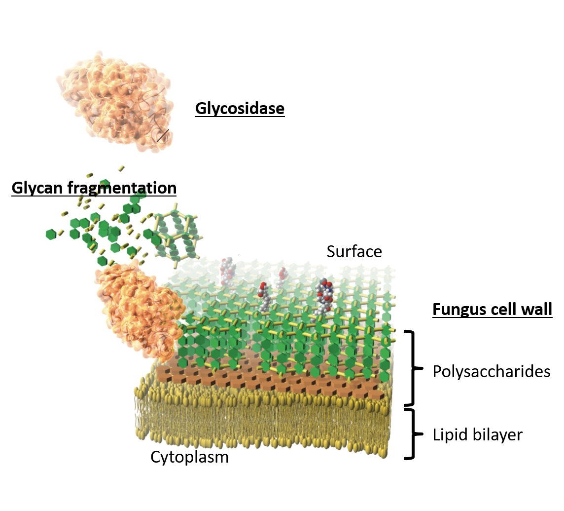 Many of plant diseases are generally caused by either ascomycetes or basidiomycetes that belonging to filamentous fungi. "Filamentous fungi" is hypha, and it is proliferated to mycelia. The cell wall is engineered as a composite material. It incorporates a mix of cross-linked fibers and matrix components. The fibrous components of cell wall are glucan, chitin, and mannan, and these sugarchains contribute forming a supple and solid filiform microfibril wall. Glycosidase is one of the hydrolases that catalyzes the hydrolysis of glycosidic bonds in complex sugars. We develop a new bio-molecular type of fungicide utilizing the hydrolysis reaction of glycosidase against fungal microfibril wall. Up to now, our composite type of bacterial catalyst composed of 5 strains from class Bacilli, which produce and secrete various glycosidases, controlled 99.3% of a tomato- Pestalotia disease with Pestalotiopsis sp. Glycosidases are classified into approximately 130 families, and its catalytic reaction is roughly divided into anomeric-inversion and/or anomer- retention, and exoglycosidase or endglycosidase. Hence, the classification of glycosidase can be understood diverse, and we consider that it is possible to digest fungi cell wall efficiently, by compositely capably using these diversities of enzyme reactivity.